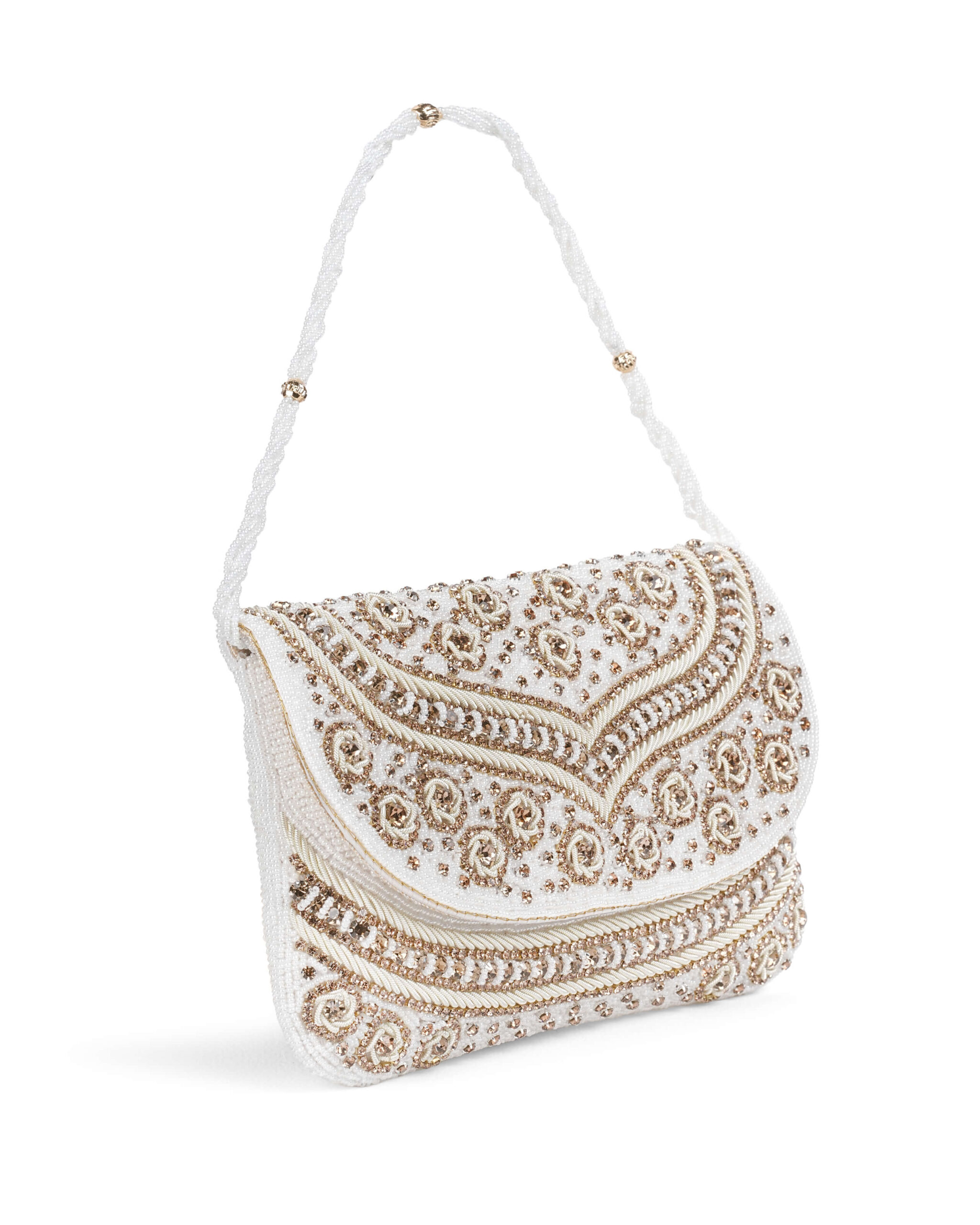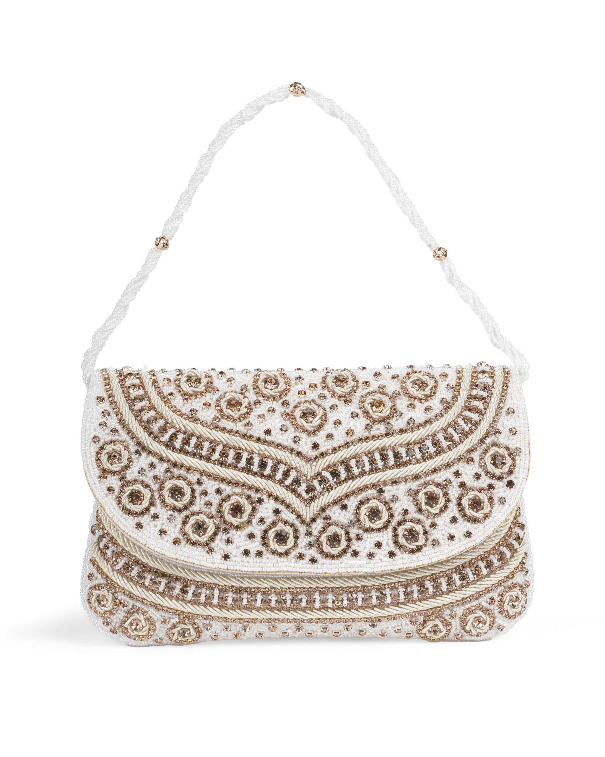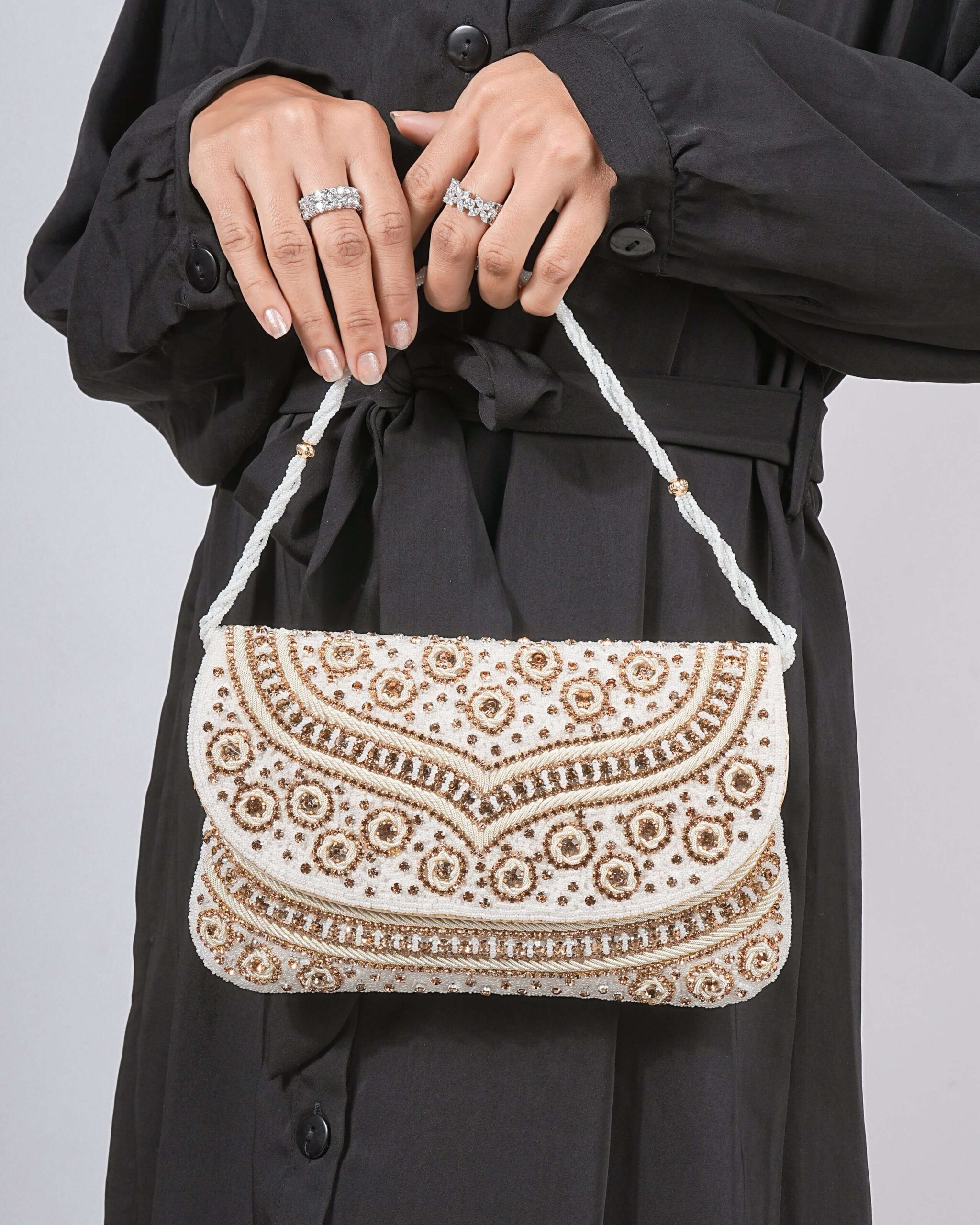 STYLE : Sparkling and sophisticated, this clutch shines with its unique curly crystal embroidery pattern. Its intricate beadwork and shimmery finish make it an eye-catching piece that pairs beautifully with bridal outfits, sarees, gowns, or party ensembles.